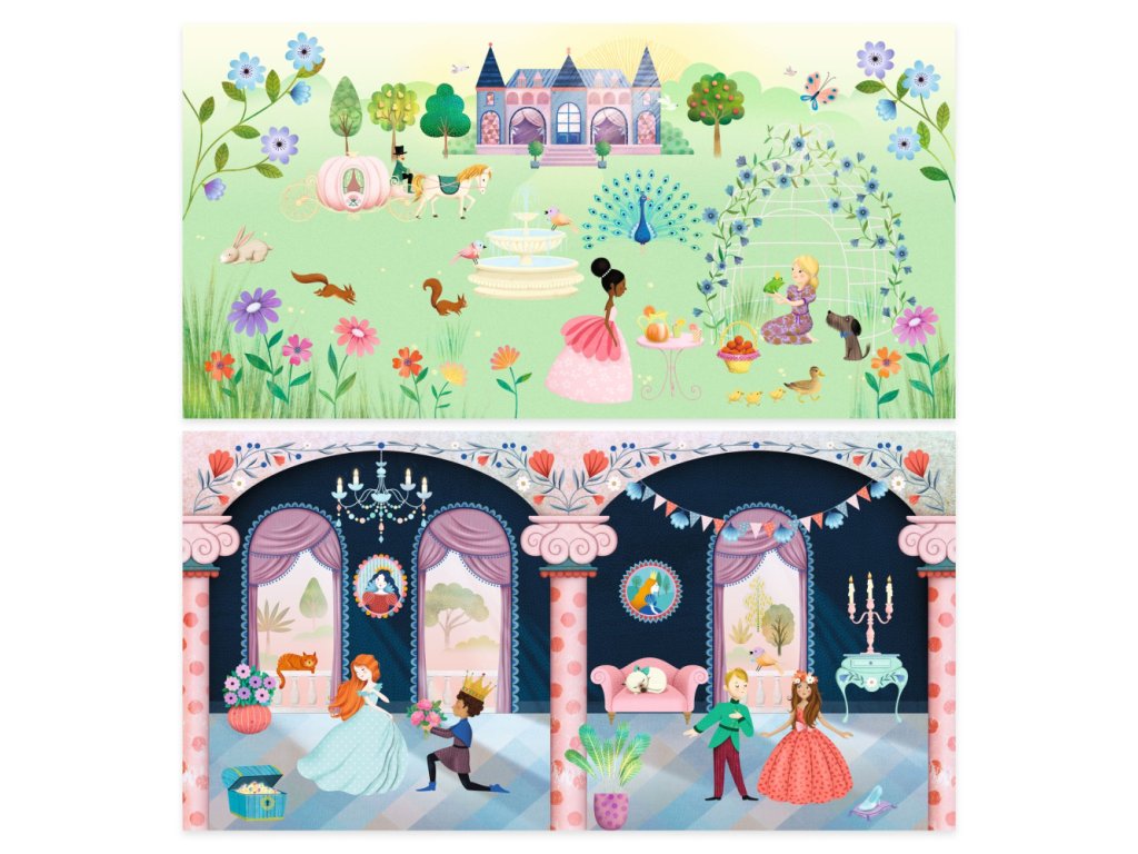 samolepky sú prehľadne umiestnené na hárkoch na okrajoch mapky. Dieťa môže dopĺňať scény zámockej záhrady a tanečnej sály v rôznych variáciách. Ideálny formát na cestovanie.